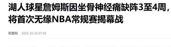 荆楚网:(湖人球星詹姆斯因坐骨神经痛缺阵3至4周,将首次无缘NBA常规赛揭幕战2025.10.10)